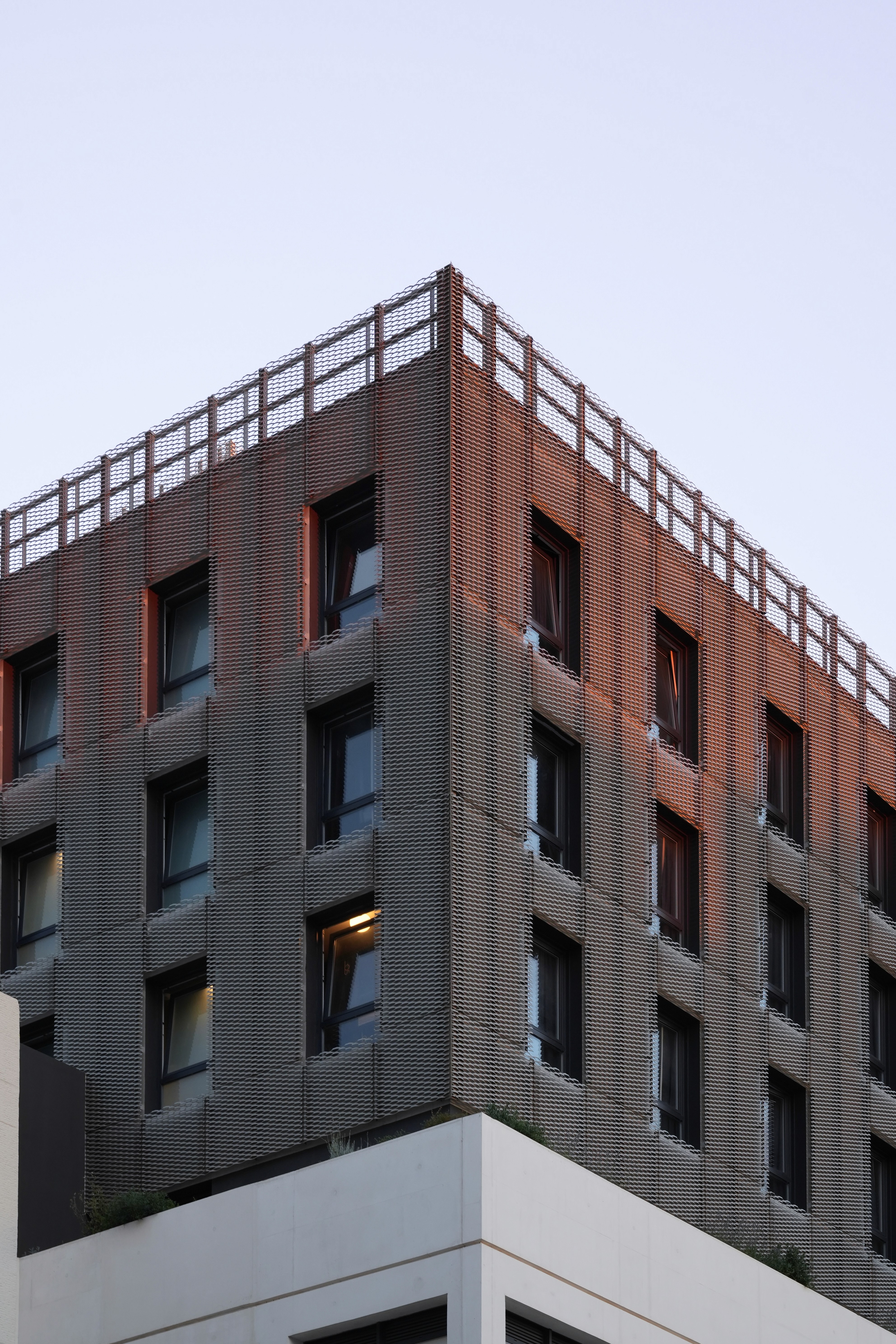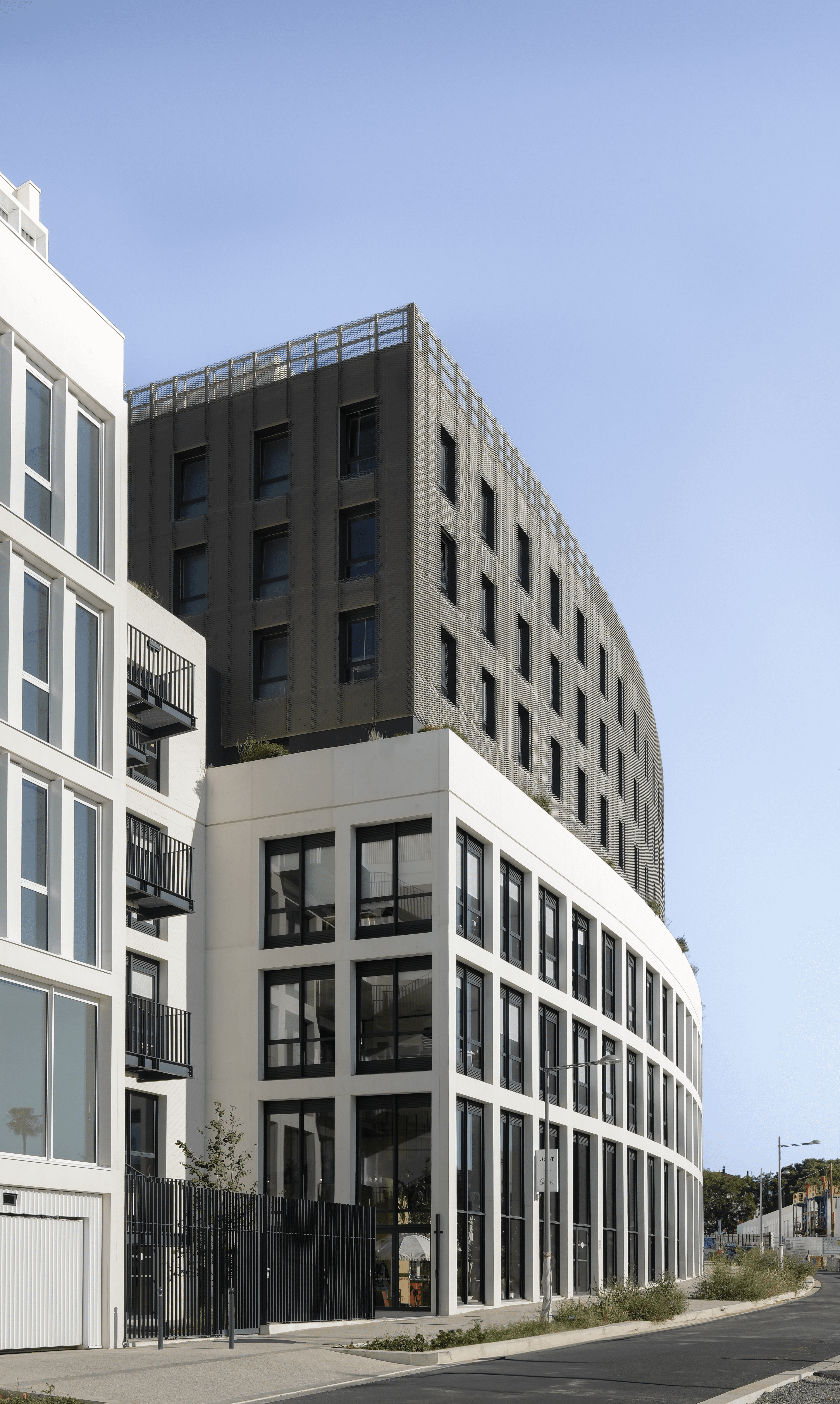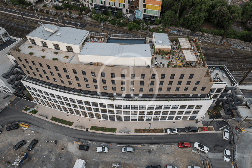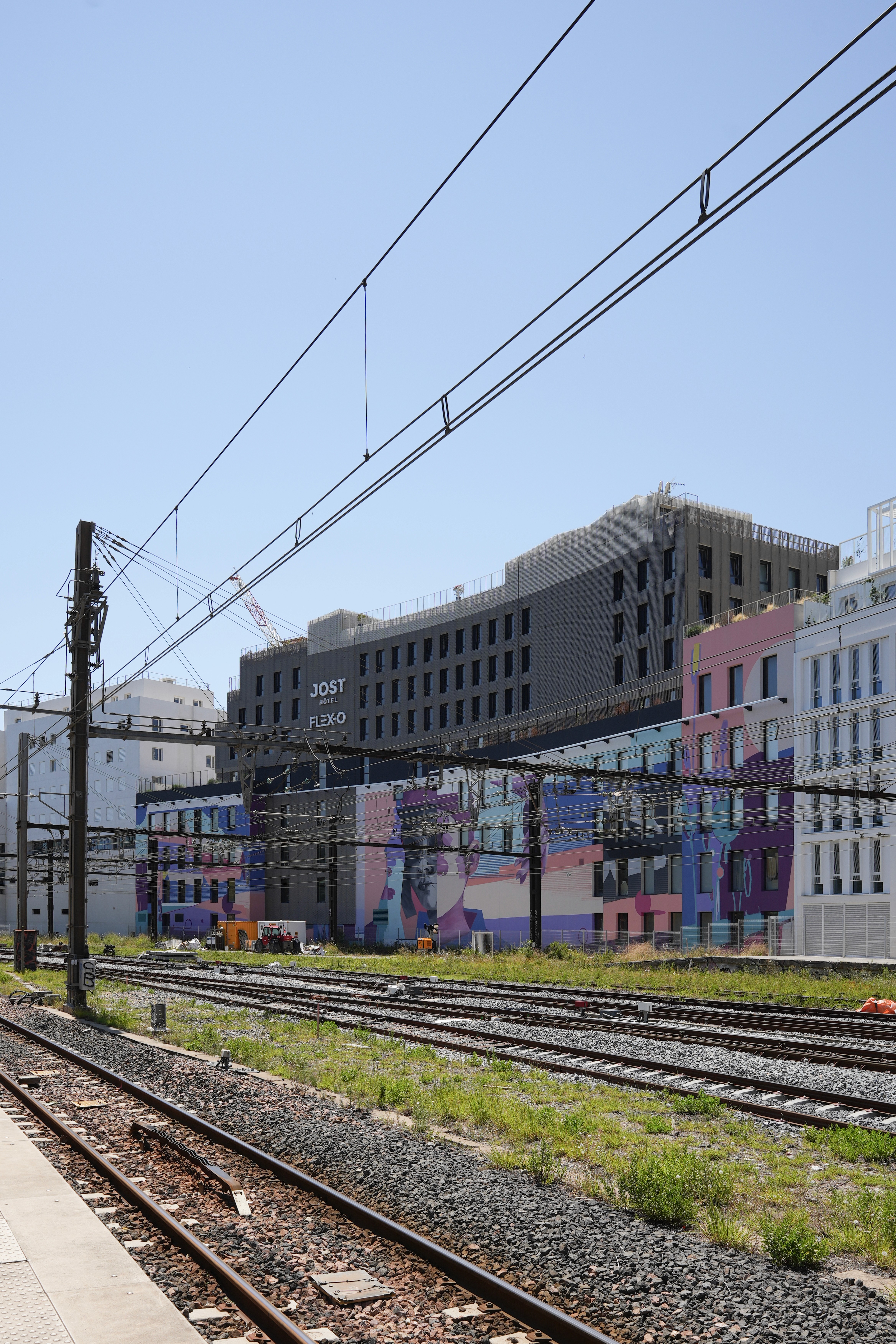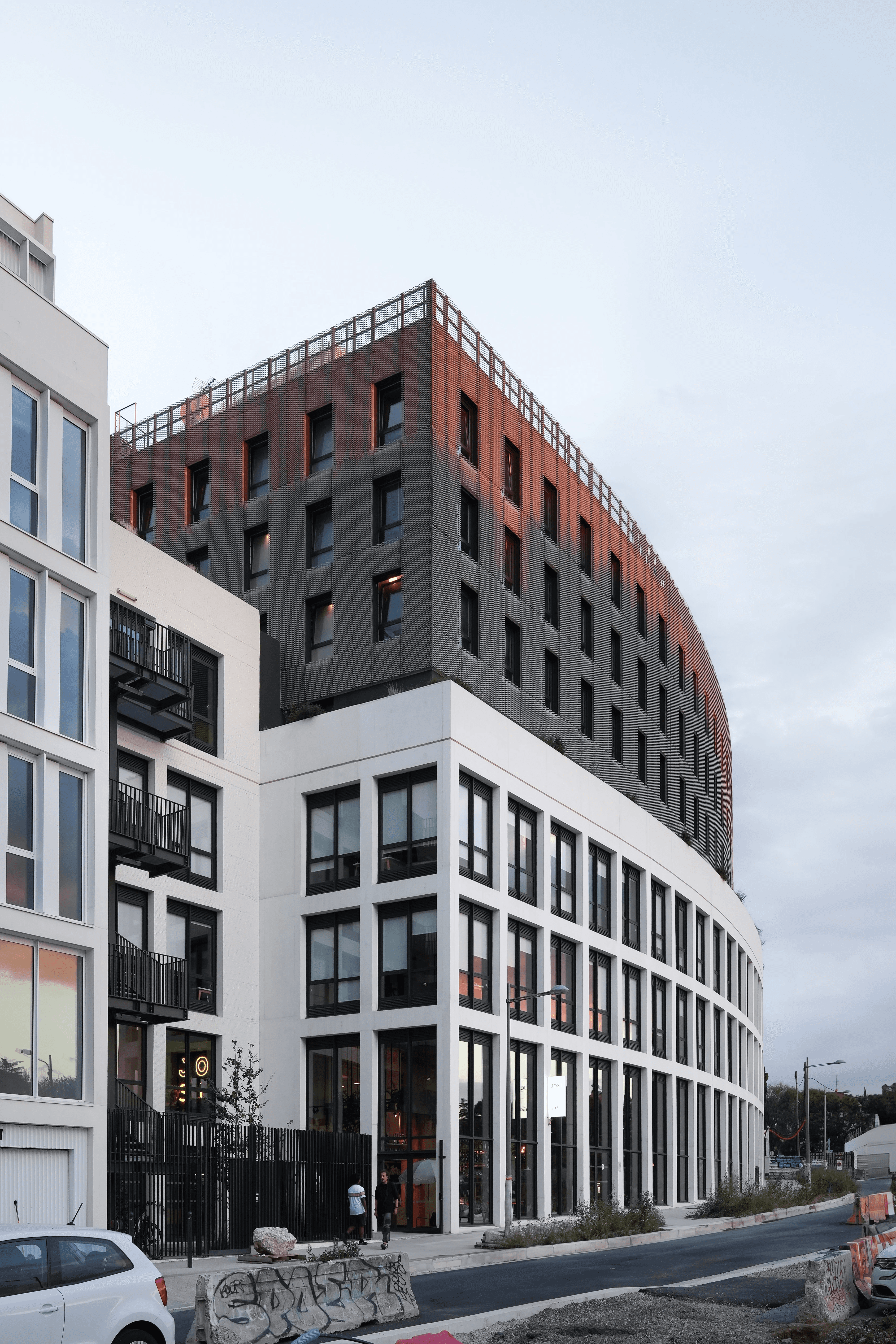 À Montpellier, À proximité de la gare Saint-Roch, le projet comprend 3 500 m² de bureaux, 3 500 m² d’hôtel, un rooftop de 300 m² avec piscine et bar, ainsi qu’un food court de 300 m² au rez-de-chaussée. En bordure des lignes de train, le bâtiment joue un rôle de barrière acoustique, protégeant le reste du quartier des nuisances sonores. Des solutions techniques avancées, notamment des systèmes sur ressorts, ont été mises en œuvre pour garantir un confort acoustique optimal. Inspiré par son environnement ferroviaire, le projet s’inscrit dans un contexte urbain marqué. Les trois premiers niveaux, en béton brut clair, se distinguent par un rythme rigoureux de menuiseries aux dimensions généreuses. En rupture avec cette base minérale, les quatre niveaux supérieurs sont revêtus de métal déployé beige nacré, jouant sur les effets de pleins et de vides. Enfin, le dernier niveau, entièrement blanc et au trait sculptural, vient affirmer la singularité du projet et en couronner la composition.